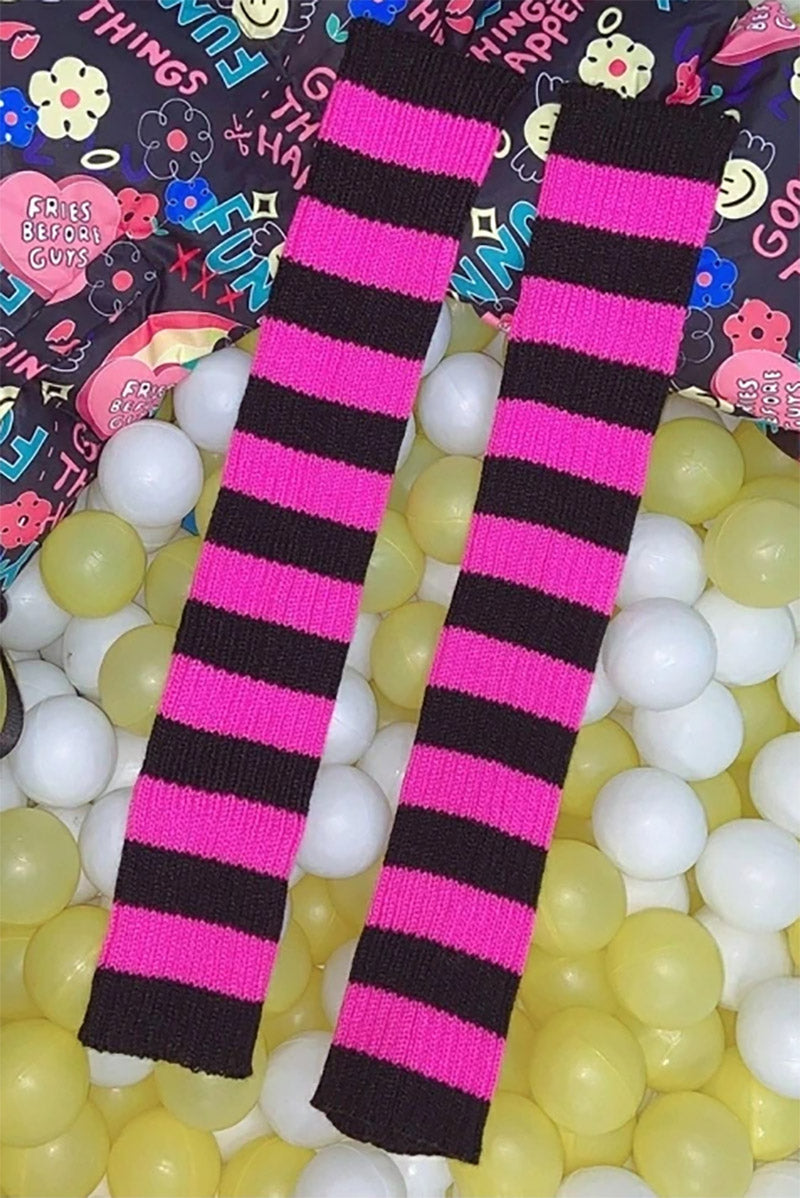 Stay snug as a spooky bug in these striped leg warmers! Bleed pink in the cozy knit, charmed with toxic pink and black stripes! Live your best alt girl afterlife in the super soft and stretchy fit, perfect for wearing with your fav pair of baddie boots.