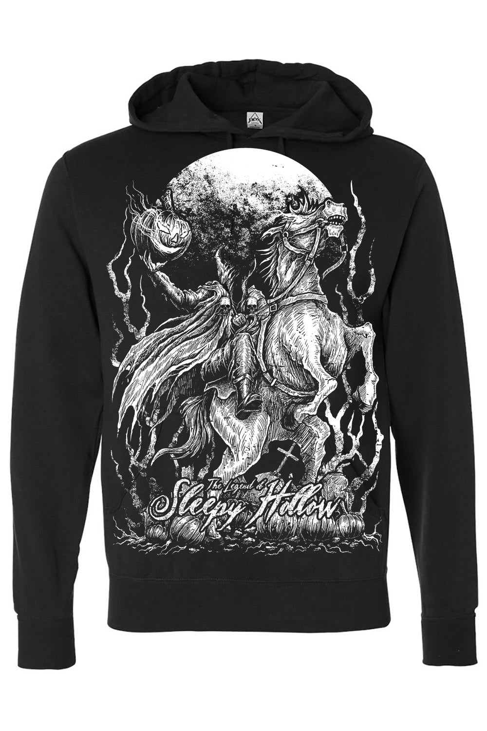 Ride into the dead of night in this chilling fantasy hoodie! Treat every day like Halloween in the heavy metal design, featuring the Headless Horseman riding his infernal horse and hoisting his disembodied pumpkin head. The words The Legend of Sleepy Hollow haunt the cemetery of jack-o-lanterns in fiendish font below, paying homage to Tim Burton’s horror movie masterpiece.