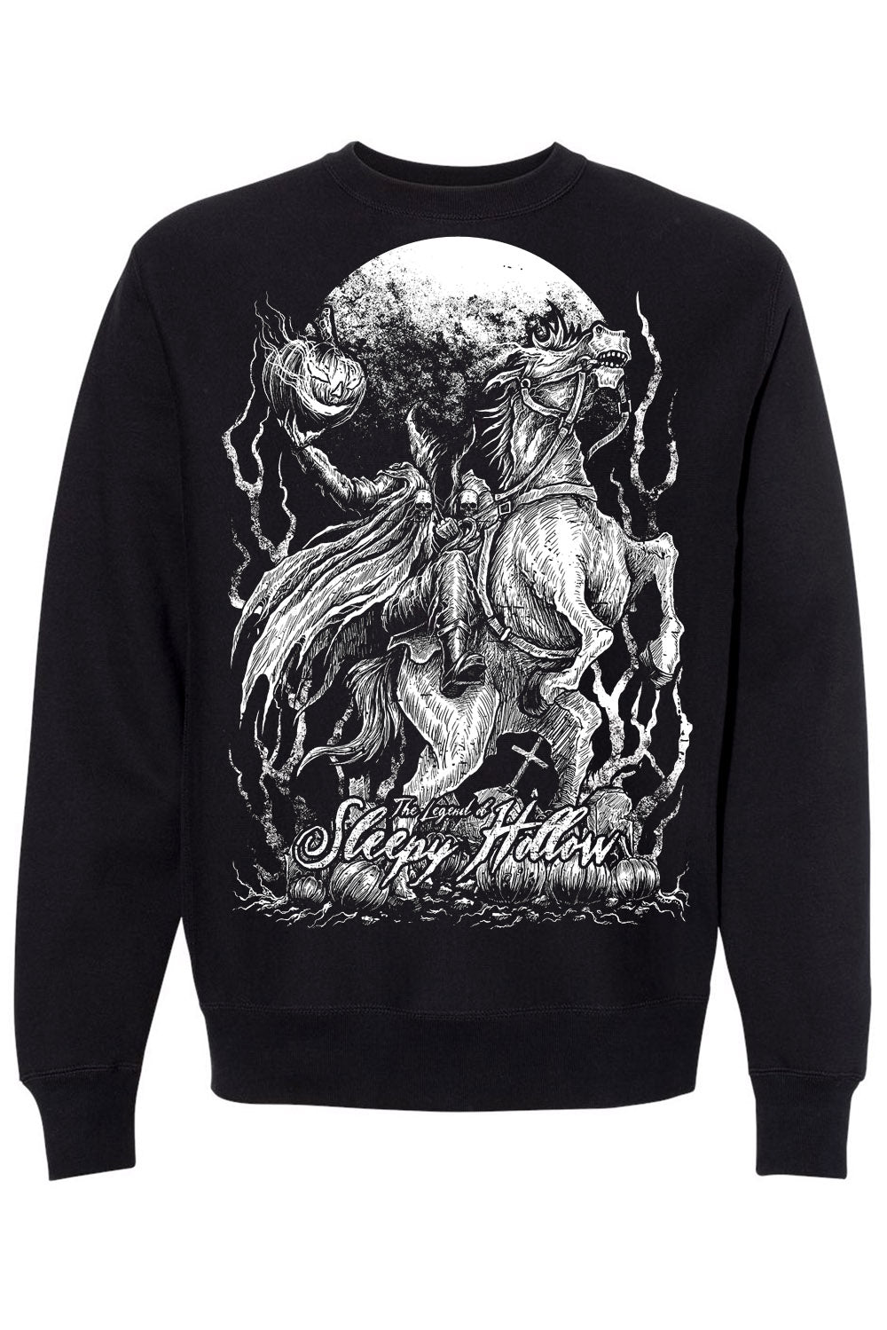 Ride into the dead of night in this chilling fantasy sweatshirt! Treat every day like Halloween in the heavy metal design, featuring the Headless Horseman riding his infernal horse and hoisting his disembodied pumpkin head. The Legend of Sleepy Hollow haunts the cemetery of jack-o-lanterns in fiendish font below, paying homage to Tim Burton’s horror movie masterpiece.
